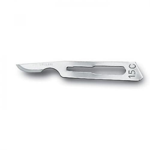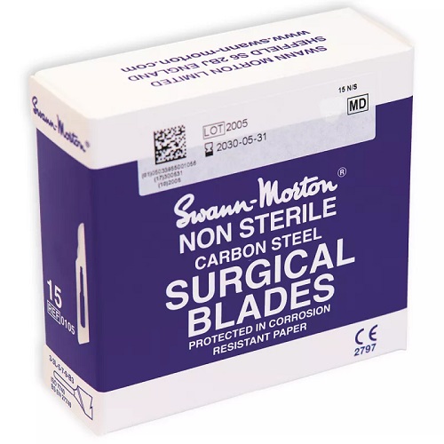 Lames de bistouri non-stériles N°15 Swann-Morton pour manche à embout N°3 Emballage par 5 unités sous sachet scellé qui empêche la corrosion. Boîte de 100