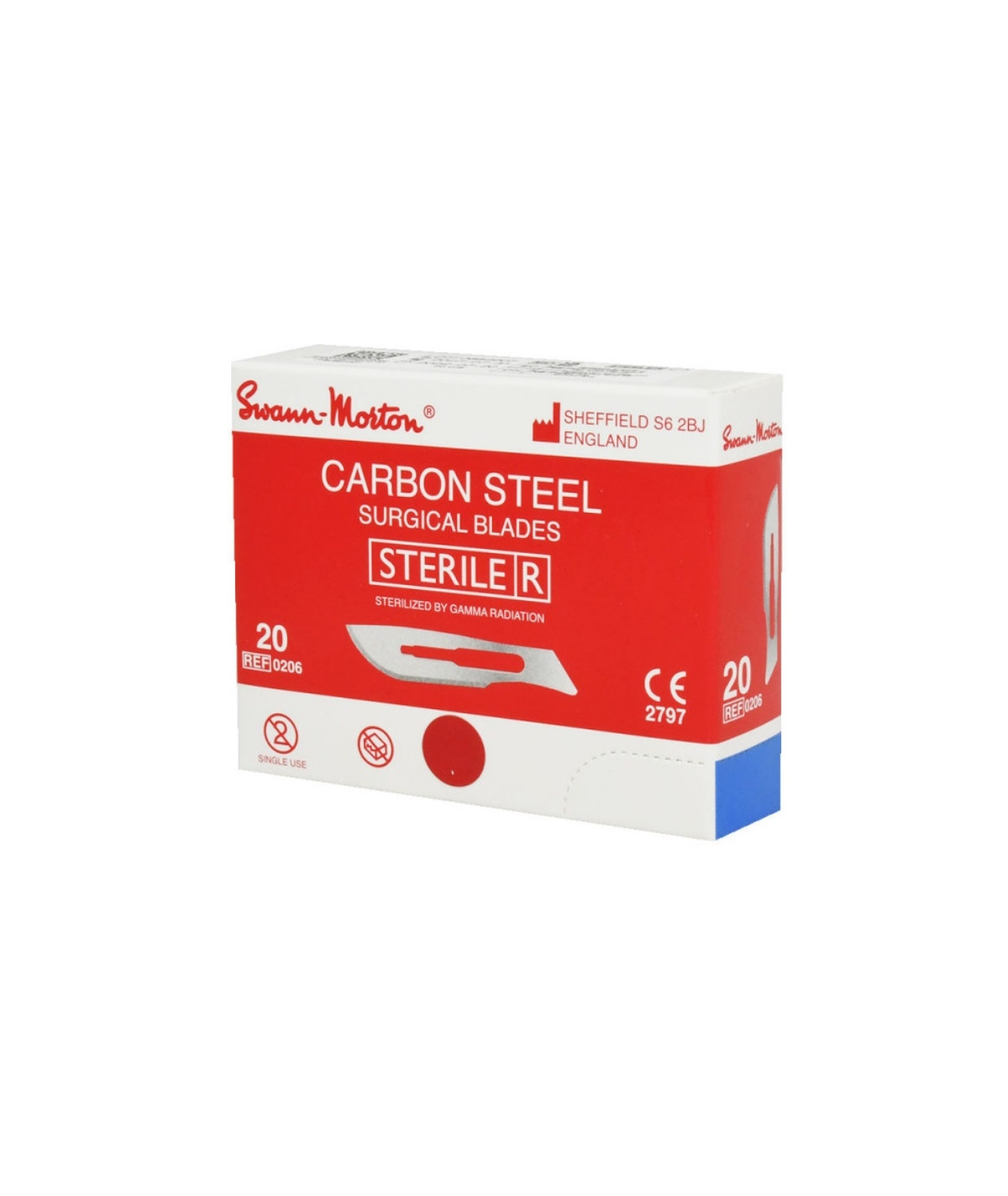 Lames de bistouri stériles N°20 Swann-Morton pour manche à embout N°4 Emballage par 5 unités sous sachet scellé qui empêche la corrosion. Boîte de 100
