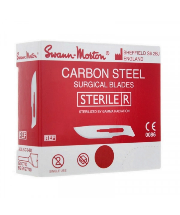 Lames de bistouri stériles N°21 Swann-Morton pour manche à embout N°4 Emballage par 5 unités sous sachet scellé qui empêche la corrosion. Boîte de 100