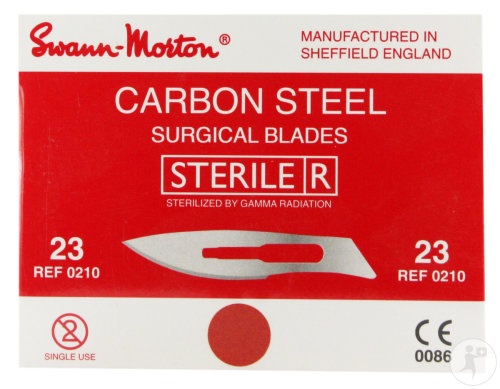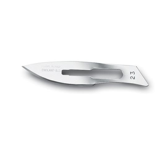 Lames de bistouri stériles N°23 Swann-Morton pour manche à embout N°4 Emballage par 5 unités sous sachet scellé qui empêche la corrosion. Boîte de 100