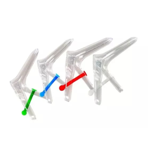 Speculum vaginal en polystyrène transparent à usage unique. Système de blocage à clé en polypropylène coloré. 4 coloris définis en fonction du diamètre du speculum. 50 unités par cartons